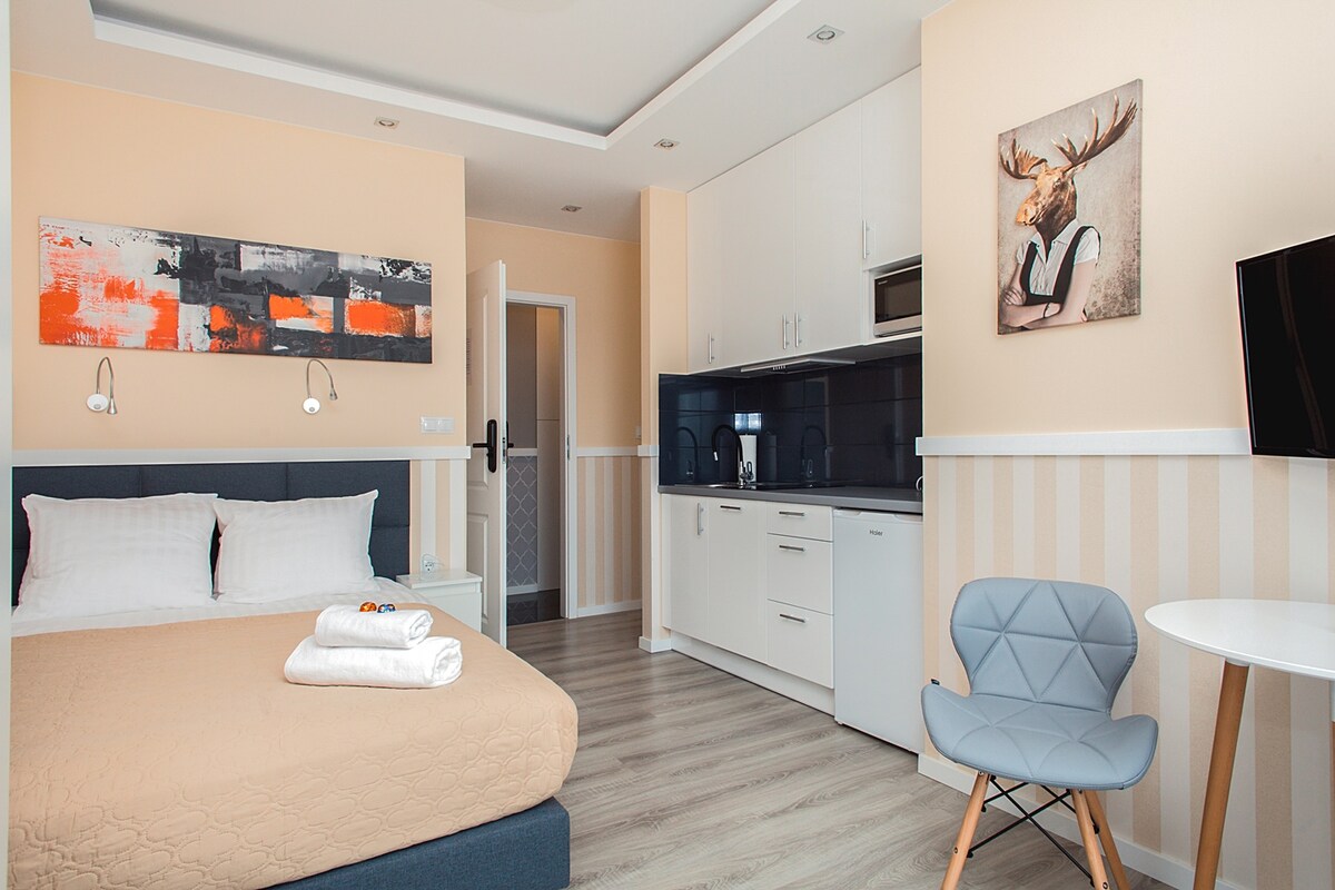 Bienvenido a Rose Studio, un espacio elegante y acogedor con una cómoda cama tamaño king, perfecta para relajarse después de un día en la ciudad. El estudio cuenta con un baño privado con ducha, una cocina totalmente equipada con lavavajillas, placa de inducción, hervidor y microondas. ¡Disfrute de Smart TV, Wi-Fi rápido y escritorio! Sal a tu terraza privada y disfruta de tu café de la mañana. ¡Ideal para estancias de negocios o de placer!