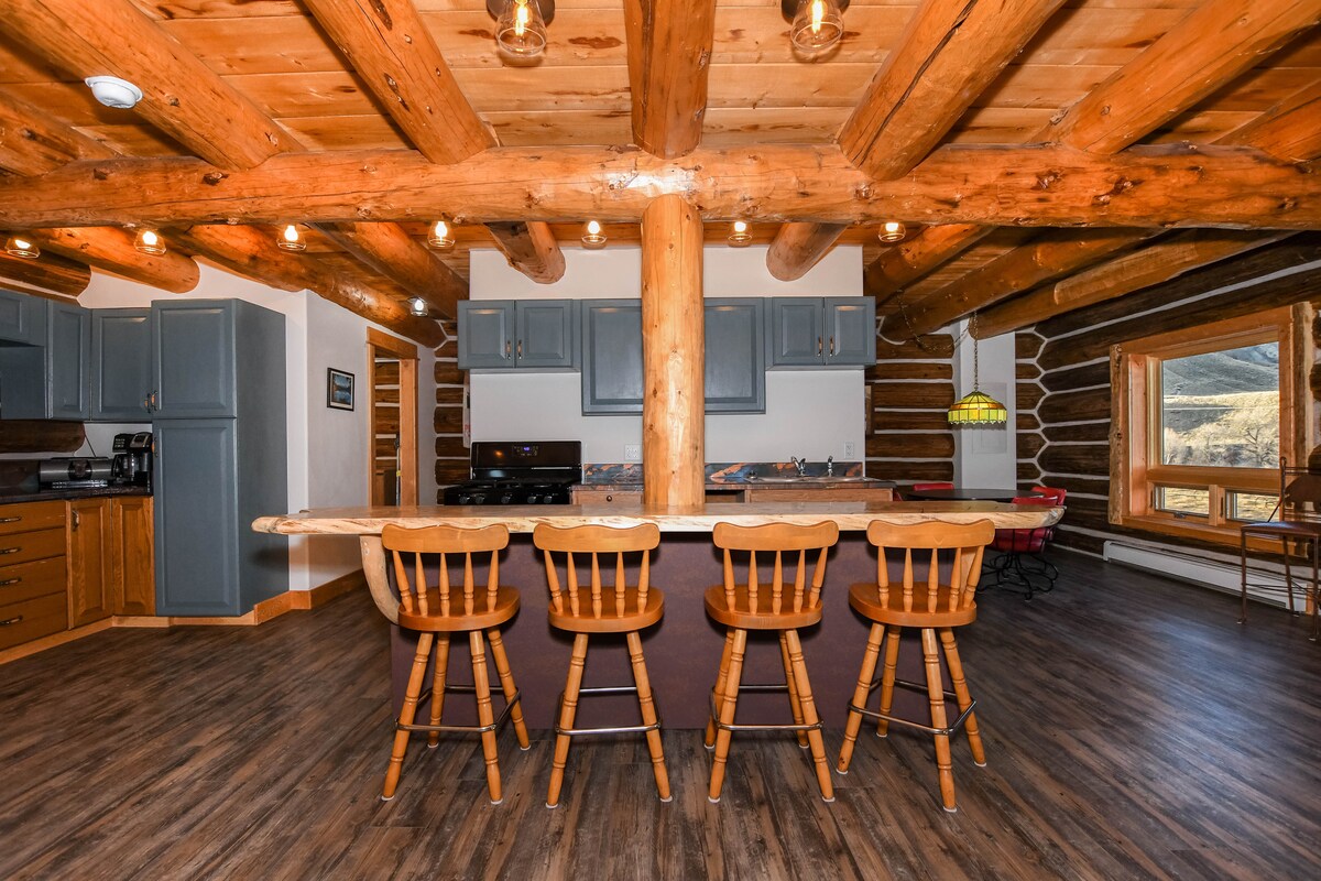 Esta impresionante casa rústica pero moderna de troncos hechos a mano, totalmente amueblada, se encuentra en la ubicación perfecta para ver el amanecer y la puesta de sol sobre el río Shoshone. Acceso a pesca y senderismo junto con hermosas vistas a la vida silvestre. Este granero de troncos único fue rescatado y recuperado con los primeros postes telefónicos de cedro en el valle cuando se levantó la presa Buffalo Bill, lo que aumentó su encanto e historia.
