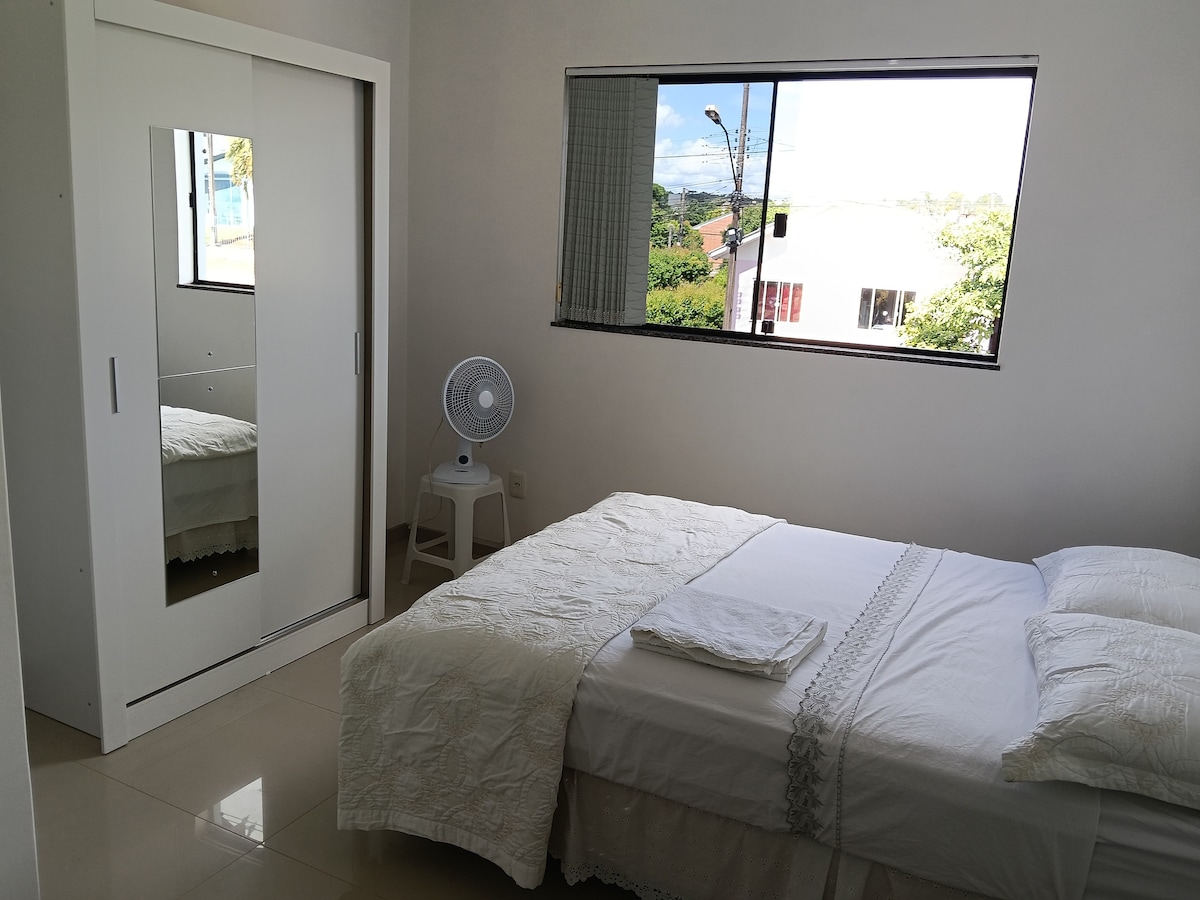 Quarto com banheiro privativo sem espaços compartilhados com a casa, aconchego para sua estadia.