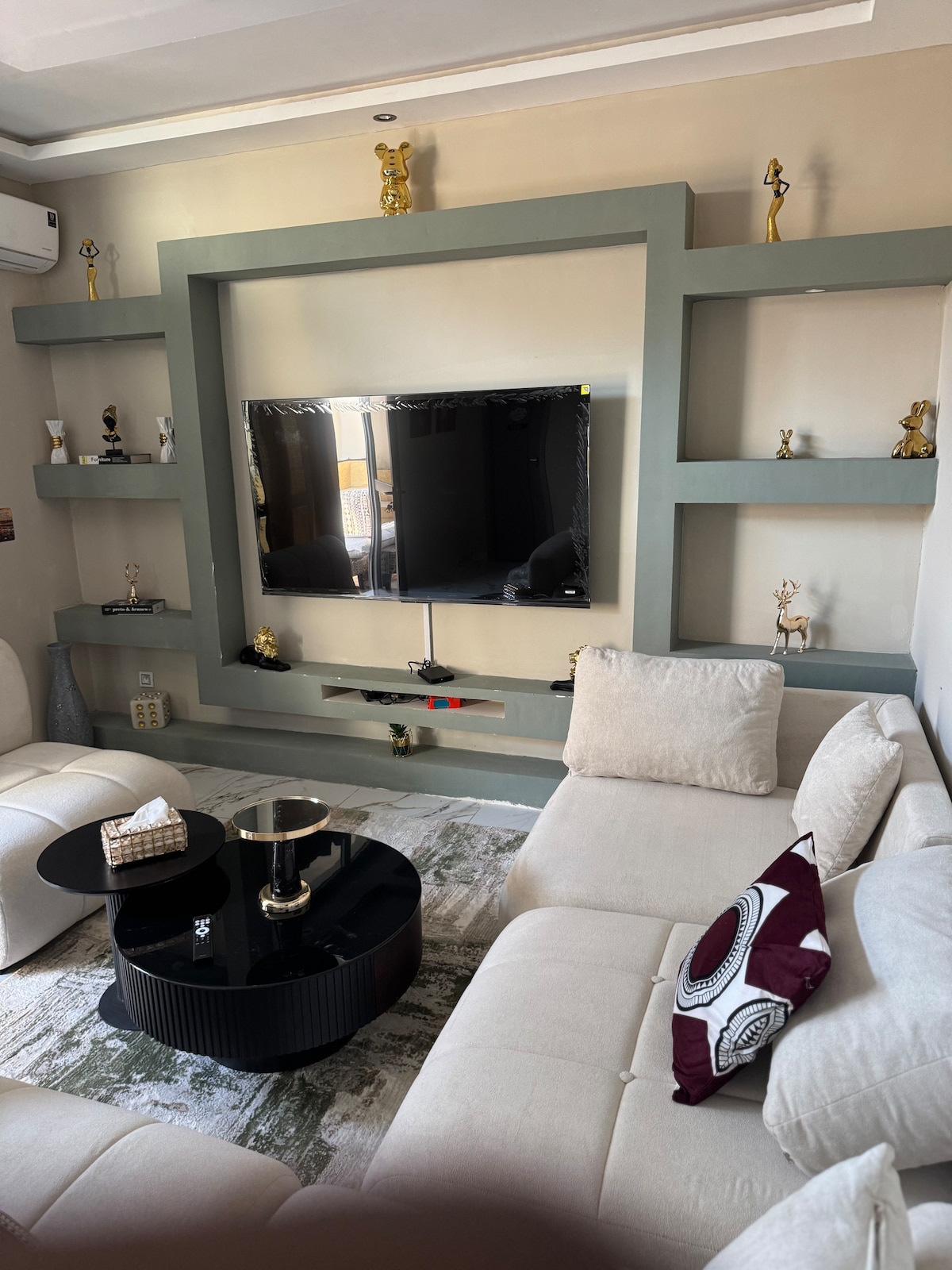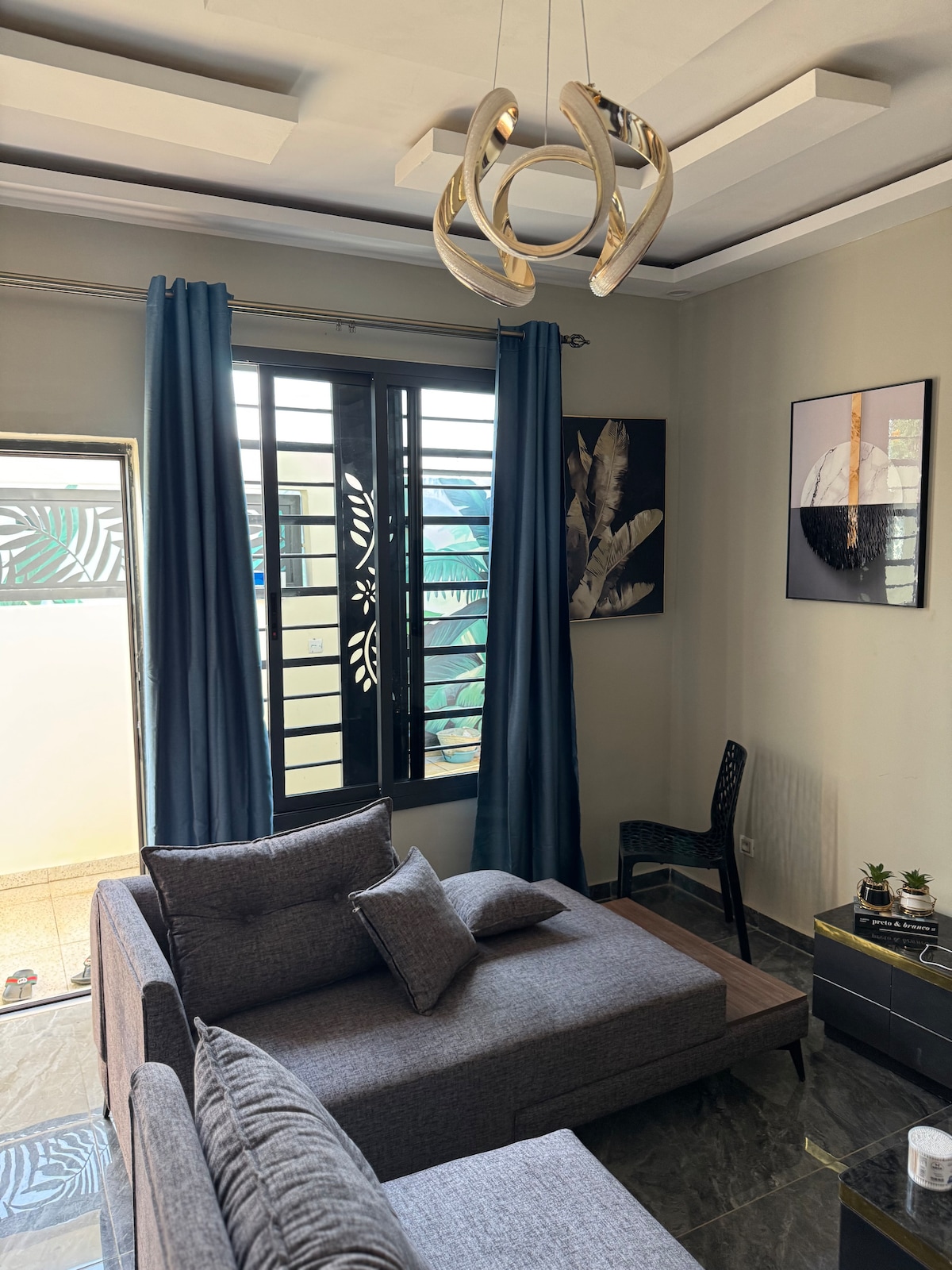 Welcome to this stylish, fully furnished 2-bedroom apartment in the heart of Yamoussoukro. The living area features sleek black sofas and a large TV for relaxing evenings. The space is bright with modern ceiling lighting and elegant curtains, creating a warm and inviting atmosphere. Ideal for families or solo travelers, the apartment offers all the amenities you need for a pleasant stay. Enjoy a peaceful experience in this beautifully decorated home, perfect for both vacation and business trips.