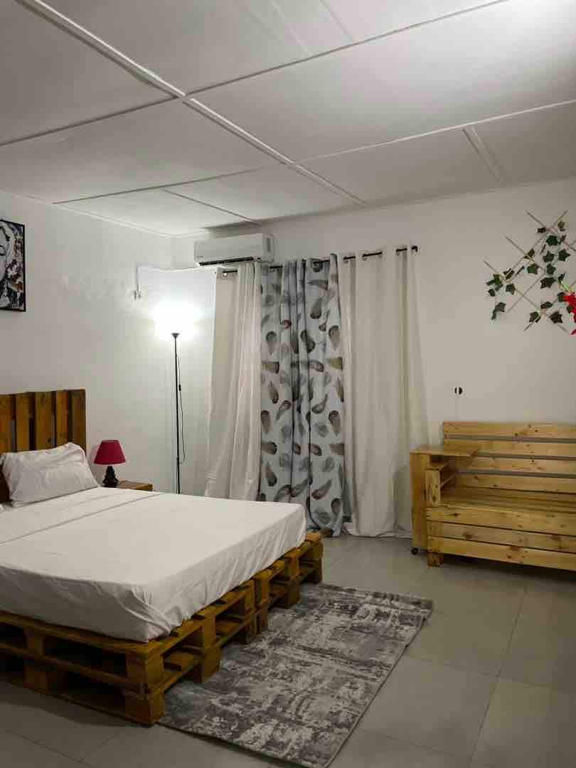 Détendez-vous dans ce logement élégant et discret, situé au quartier Ebenezer à Morofé, zone très calme, à 5mn du centre ville de Yamoussoukro. Studio Américain 2 pièces, 1 grande chambre et 1 petit vestibule, équipé TOUT CONFORT, chauffe-Eau, Climatiseur, Télé, Canal + basique, bouilloire, Ventilateur, Rangements, vaisselle pour 2 personnes, parking, superette et restaurant avec piscine en traversant la rue. Meilleur rapport qualité-prix possible.