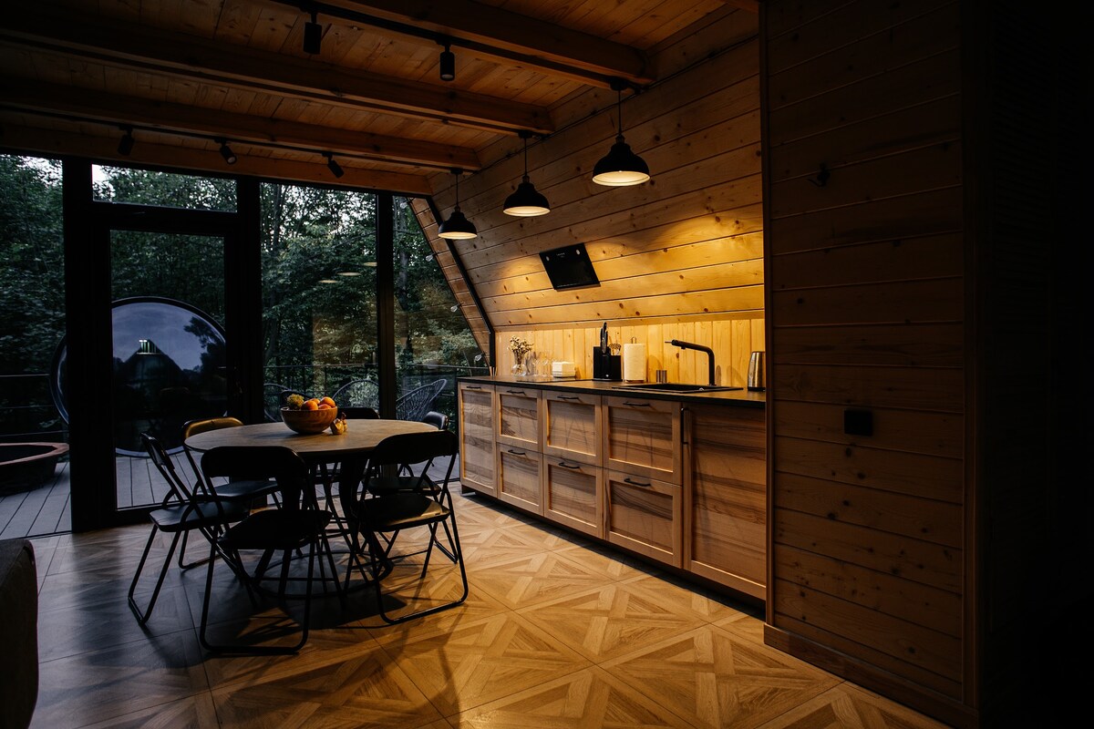 La unidad con la naturaleza se siente mejor en la cabaña junto al bosque. Hay conejitos corriendo, docenas de pájaros volando, ardillas saltando, arbustos de arándanos y moras en flor. Y dentro de la casa, todo lo que necesitas para unas vacaciones de calidad: ventanas panorámicas, una gran cama con almohadas de cáñamo y una manta, una estufa con leña, una cómoda cocina, una ducha de efecto lluvia con una vista fantástica de la puesta de sol. Una terraza con una zona de relajación, un tazón de fuego y una taza (tina) también están a tu servicio en cualquier momento.