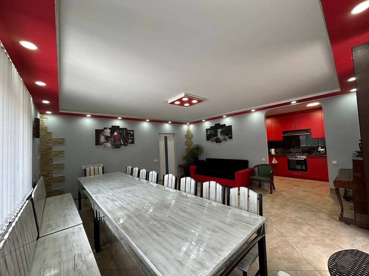 Bienvenido a una gran casa con un hermoso jardín con muchos árboles frutales. La casa está cerca del gran parque botánico y cerca del Water Wold, donde disfrutarán tanto adultos como niños. Desde el centro de Ereván se tarda unos 10 minutos en coche con minibús. Desde tu día ajetreado en el centro volverás a casa tiempo tranquilo para ti, planta baja puedes tomar el. sauna,+ gastos adicionales, con ducha de verano. La casa es buena para familias o grupos de amigos que visitan Ereván. ¡Espero que disfrutes de tu tiempo!