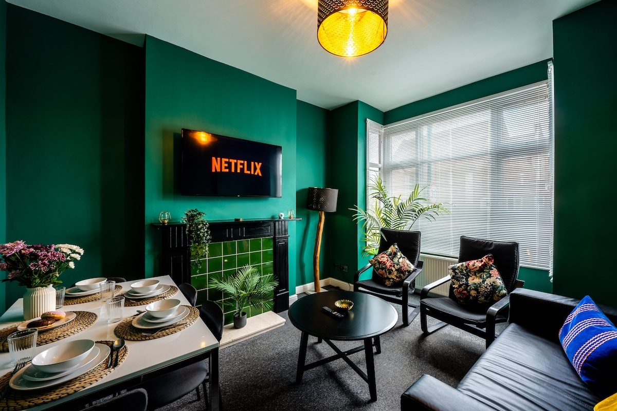 🎶 10min drive/Taxi → Heaton Park – Ideal for Oasis fans 🏙️ 10min drive/Taxi → City Centre 👥 Great 4 families, large groups, teams, stags/hens 🏡 Grand 5BR home – 220sqm – Sleeps 16 & garden 🅿️ Free parking 🍽️ Fully equipped kitchen 🚌 Buses every 5min (0.2mi) → city 🛒 0.3mi → Asda 🎤 10min drive → AO Arena & Etihad Stadium Kindly note that a refundable security deposit (authorised and held by your card provider, not charged to us) is part of the booking process.