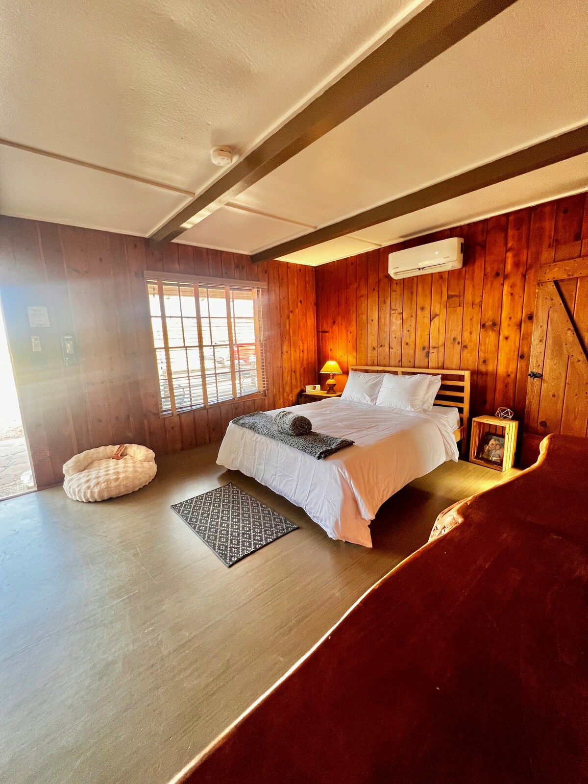 Relájate bajo el cielo del desierto en la acogedora comodidad de la habitación Moonlight Queen, que cuenta con una lujosa cama tamaño queen y una decoración elegante y serena. Este espacio es perfecto para relajarse después de un día explorando Joshua Tree o disfrutar de una noche tranquila. Con tonos relajantes y detalles bien pensados, es una escapada ideal tanto para viajeros solitarios como para parejas.