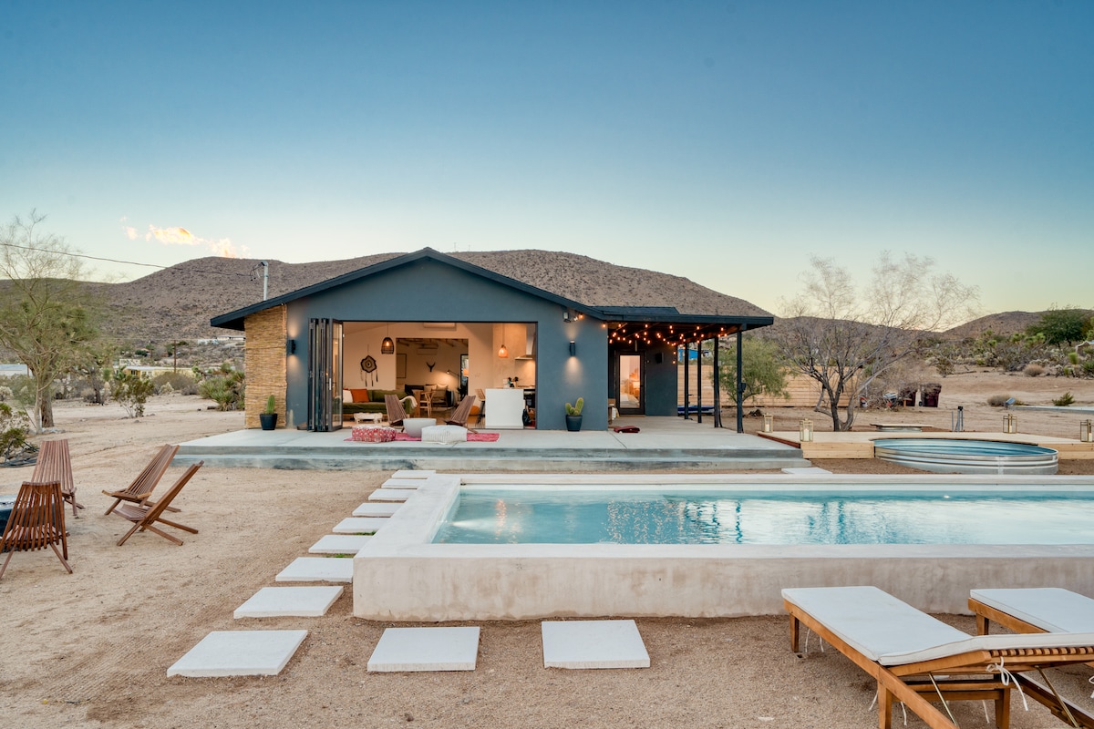 Sumérgete en esta lujosa casa de 3 dormitorios y 2 baños recién construida, con amplias ventanas que revelan los impresionantes paisajes, una piscina climatizada y un spa para disfrutar de baños bajo las estrellas, y un espacio dedicado al fitness. Relájate bajo cielos infinitos en 2 acres en tu propio oasis privado, perfecto para observar las estrellas y reunirse en el patio. Despiértate con impresionantes amaneceres, explora las maravillas de otro mundo de Joshua Tree y vuelve para darte un baño rejuvenecedor en tu refugio en el desierto.