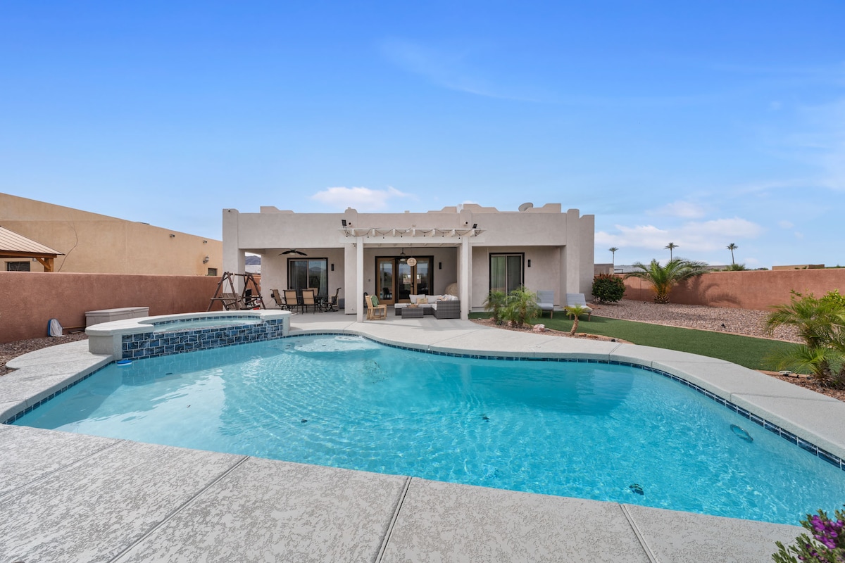 Casa de 4 dormitorios con piscina y spa ubicada en las estribaciones. Capacidad para 8-10 personas y cuenta con internet inalámbrico con 2 televisores Roku. Barbacoa de gas, chimenea al aire libre, altavoces Bluetooth y ducha al aire libre. El río Colorado está a 20 minutos, el campo de golf Mesa Del Sol está al lado. Se aceptan alquileres corporativos/para personas que huyen del invierno. Estancia mínima de 3 noches y tarifas con descuento para estancias semanales, mensuales y más largas. La calefacción del spa está incluida en el precio. La calefacción de la piscina tendrá un coste adicional.