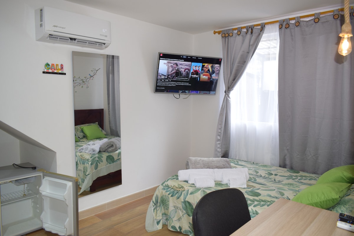 Relájate en esta escapada única y tranquila. Contamos con un aparta estudio en el último piso, el cual tiene una habitación con cama doble ideal para parejas y un sofá cama que permite la acomodación de una tercera persona, baño privado, aire acondicionado, nevera y televisión, un espacio seguro y cómodo. Ubicado a 20 min del aeropuerto Alfonso Bonilla Aragón, 15 min del centro de eventos valle del pacifico, a 10 min de zameco, menga, cerca al sena, cerca a la base aérea, boulevard del río.
