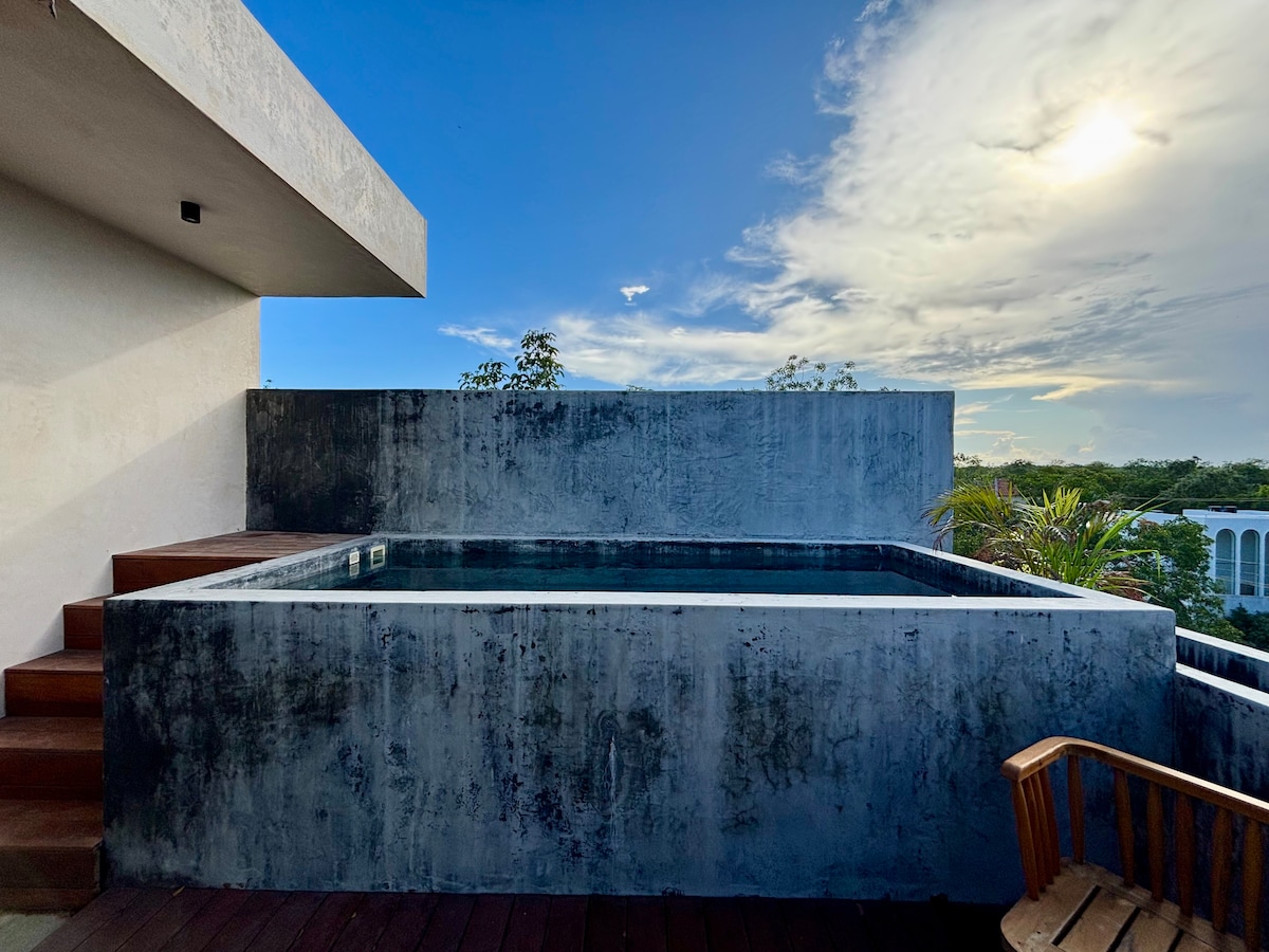Stay in this private and intimate penthouse studio featuring a rooftop plunge pool with a fantastic view of the jungle in La Veleta. Enjoy beautiful jungle canopy views from the windows and the terrace. This hidden gem combines modern design, privacy, and peace—just a short drive from Tulum’s beaches and restaurants, is tucked away from the main roads, it offers privacy, peace, and a true sense of retreat. This is a designer building from VOID STUDIO that won PIPA 2024 at Milan.