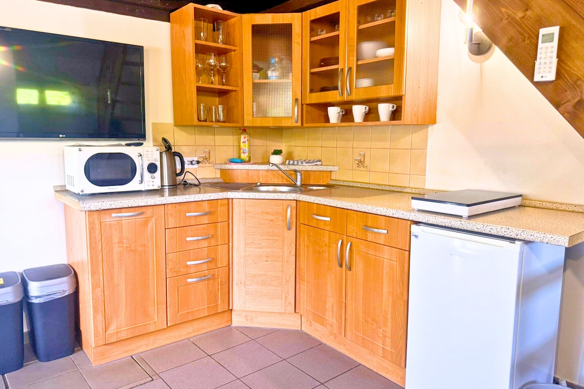 Nuestra cabaña de madera está situada entre dos ríos. Así que es un lugar maravilloso y muy tranquilo para alojarse. Abajo hay una habitación principal, con cocina moderna, nevera, lavadora, lavavajillas... hay una chimenea, que puede calentar toda la cabaña. La gran terraza es un lugar estupendo donde puedes disfrutar de tu taza de té o café. El jardín y los alrededores son un lugar estupendo para los niños. Y si el tiempo es malo, tal vez se alegrarán de columpiarse en la cabaña... :-)