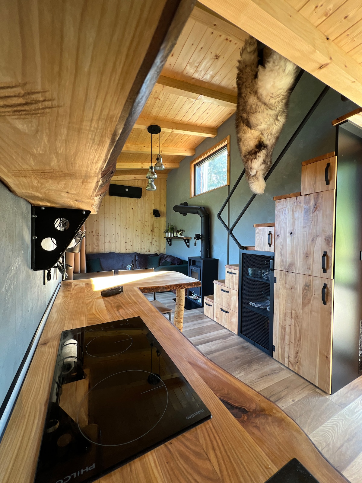 Construido con nuestras propias manos desde los cimientos hasta los muebles interiores hechos a mano. Alrededores de la casa arreglados para su comodidad: terraza con tumbonas y bañeras para bañarse en verano, bañera con agua caliente para los días de primavera y otoño, asientos al aire libre en una terraza parcialmente cubierta junto a un pequeño estanque, espacio para hacer barbacoas o asar. Y vegetación plantada por todas partes. Quería que los huéspedes experimentaran la calidad y la comodidad a primera vista y en su propia piel.