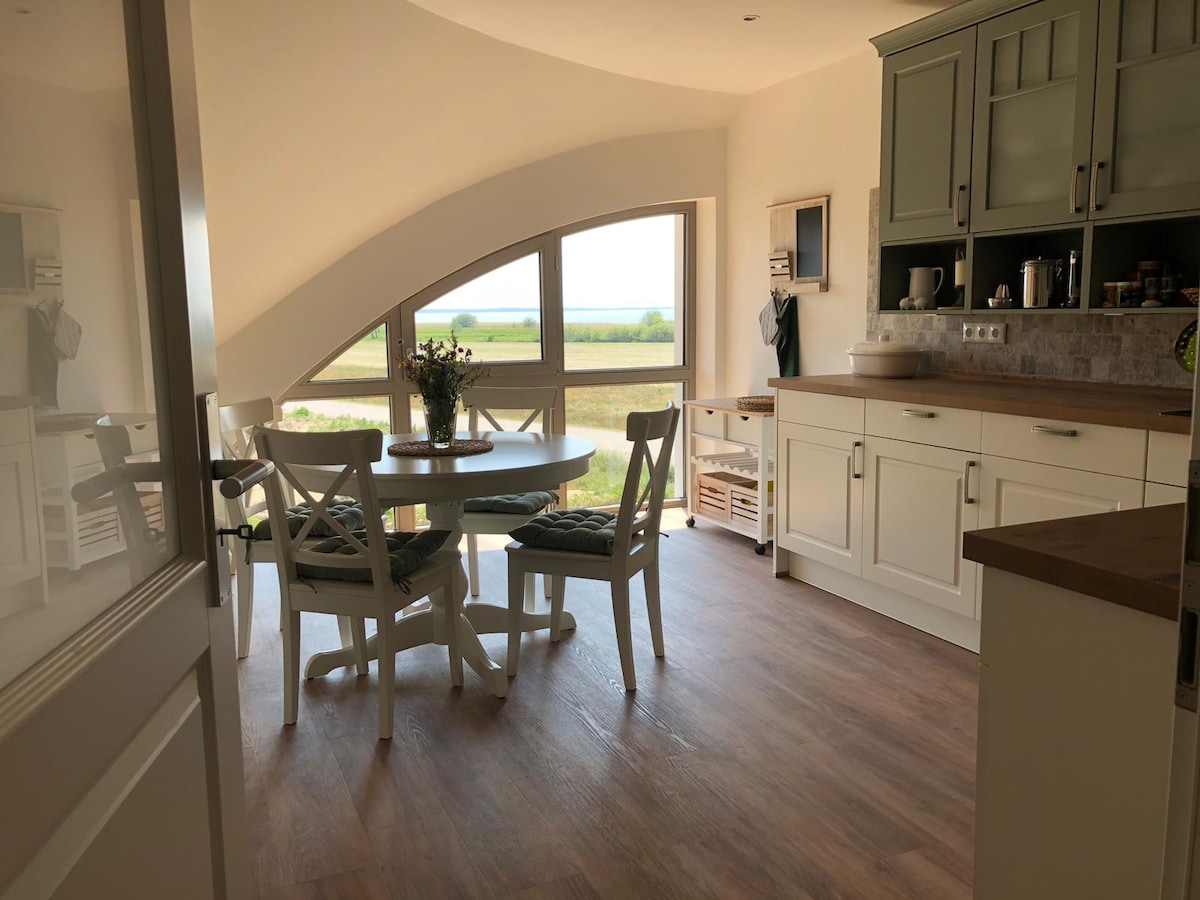 Se trata de una casa adosada en un barrio con casas de tejados de paja y vistas abiertas al Achterwasser. El tamaño de la parcela es de 1200 m². El apartamento que se ofrece en la casa adosada consta de un recibidor en la planta baja, una planta superior y un ático, y tiene una superficie habitable de 80 m². En la planta baja se encuentra el estudio de verano de la pintora Kerstin Langer. En la otra mitad de la casa adosada hay otro apartamento de vacaciones (Kielhus).