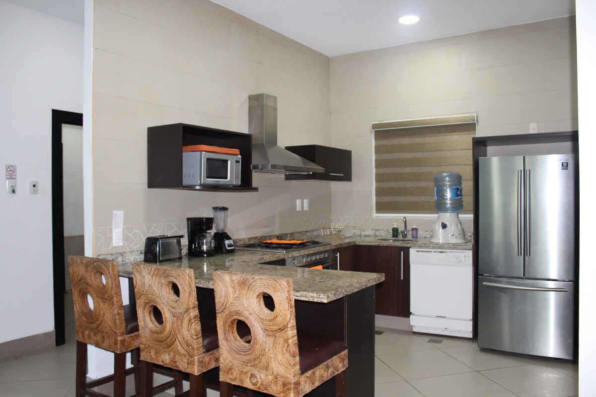 Brand new beautiful and comfortable condo right in the front beach near the MARINA of Ixtapa. Perfect for families, it has a full equipped kitchen plus a restaurant bar by the swimming pool. Excellent for weekends and long stays, cleaning and cooking service is optional. Free parking inside the building, and a fully equipped GYM.