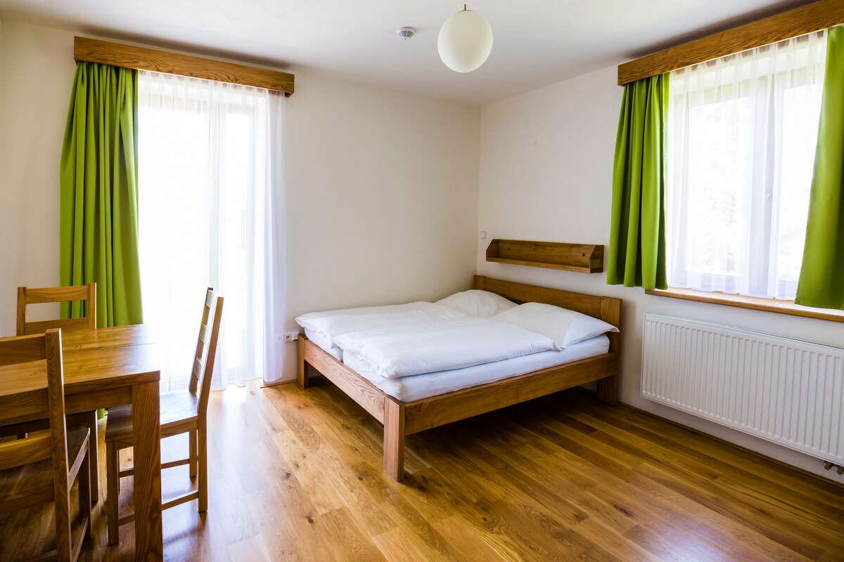 Esta habitación doble se encuentra en la planta baja de la casa de huéspedes. La habitación está equipada con una cocina pequeña, un amplio armario, un televisor inteligente y una mesa de comedor con dos sillas. El estudio tiene baño privado con bañera y aseo. La habitación tiene acceso a un patio orientado al oeste. Alojamiento ideal para parejas o familias con un niño pequeño (posibilidad de acomodar una cuna).